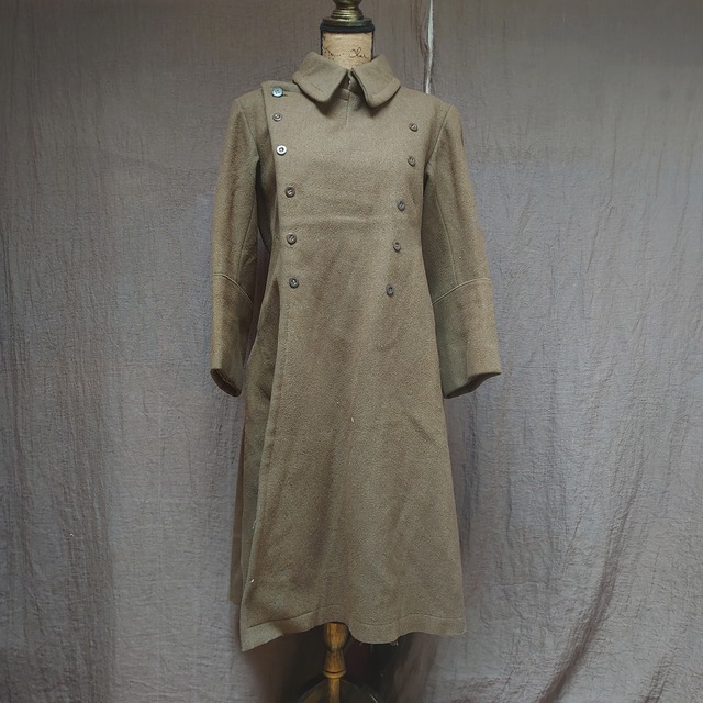 第二次世界大戦ごろの日本軍のコートになります。フランス軍のコートに似ています。 カーキ色に茶色が混ざったような深みのある渋めの色をしています。 フロントは一番上のボタン以外は比翼仕様になっています。左右にスリットポケットが1つずつ、左側に内ポケットが1つと刀を出すためのスリットがあります。 生地には無数の小さなピンホールやシミなどがありますが、近くで見ないとわからないほどで、気にならない程度だと思います。 生地は厚手のウール地で、裏地はコットンです。 平置きサイズ 肩幅45cm身幅50cm着丈102cm袖丈51cm