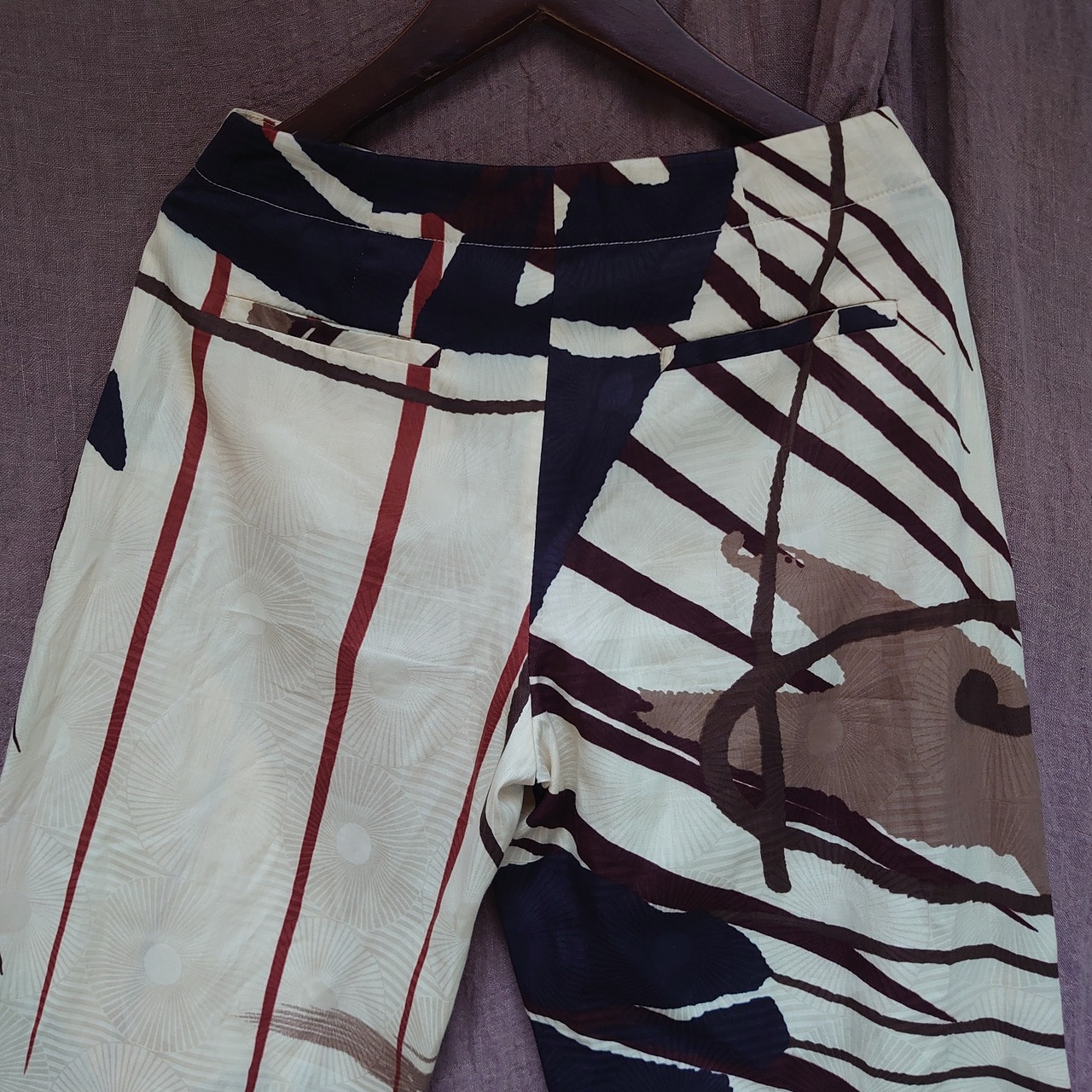 透け感が少しある織り柄の上に、総柄のプリントが施された大変手の込んだパンツになります。