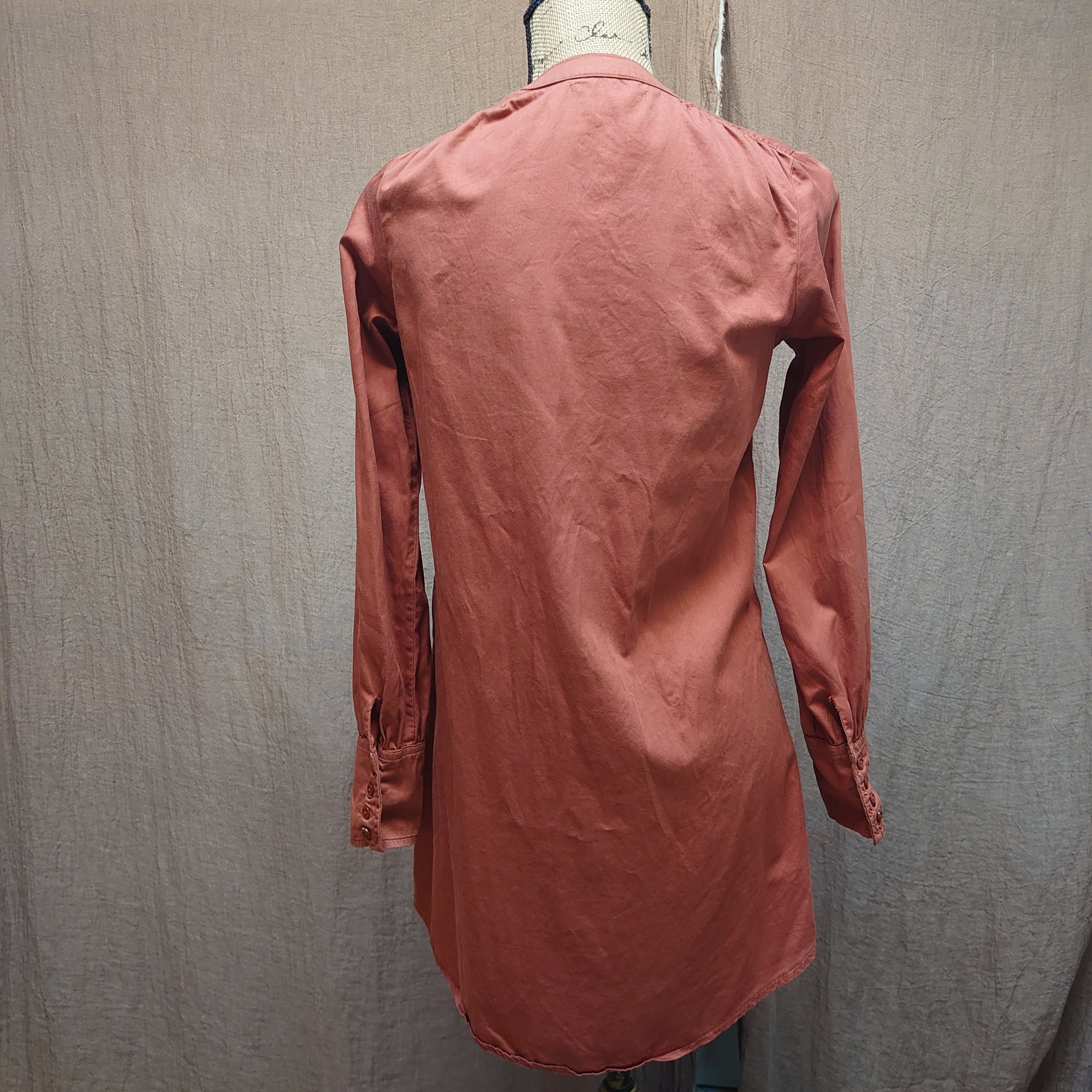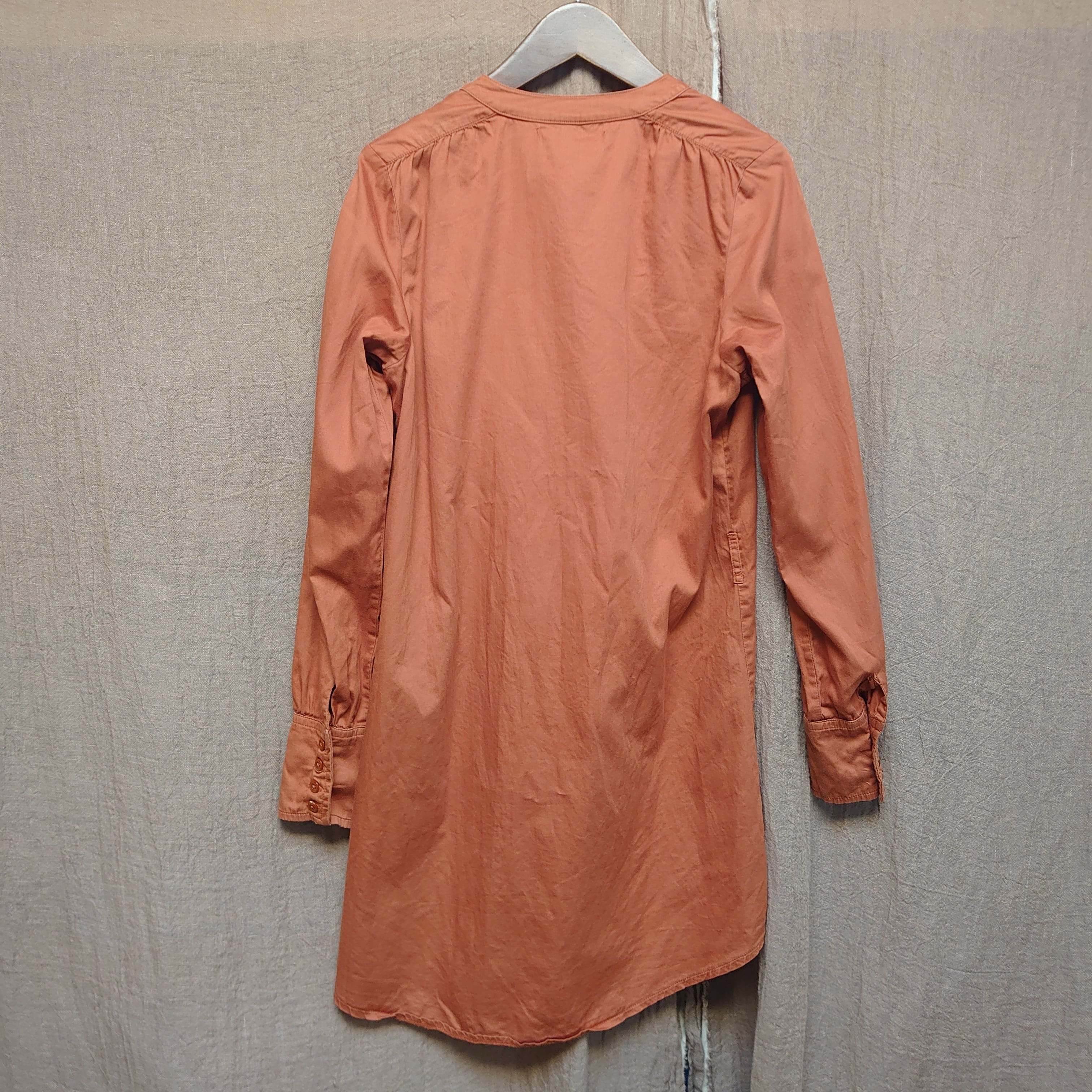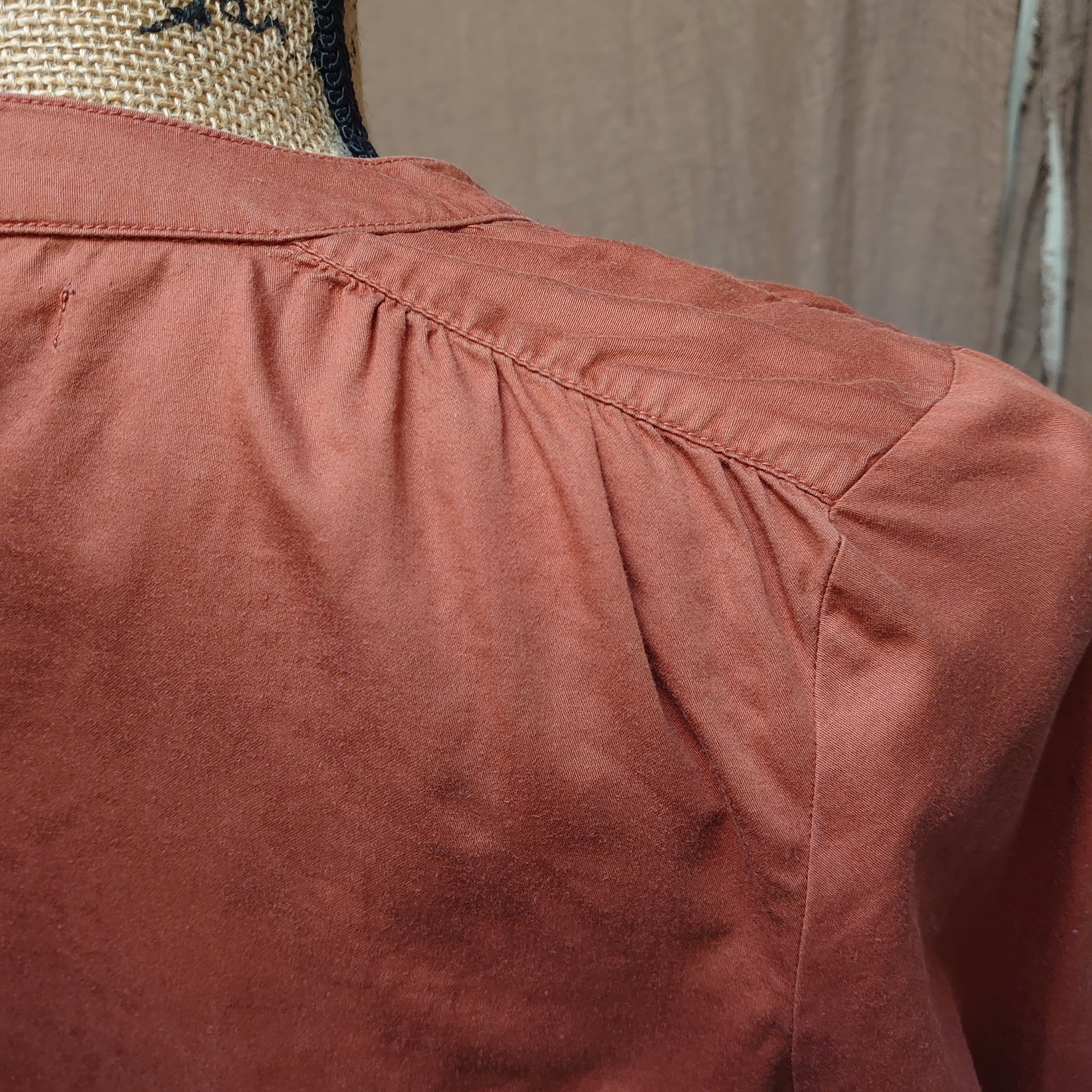 暖かみのある赤茶色が魅力的なノーカラーブラウスです。シンプルながら細身のロング丈のシルエットが印象的なスタイルを演出します。