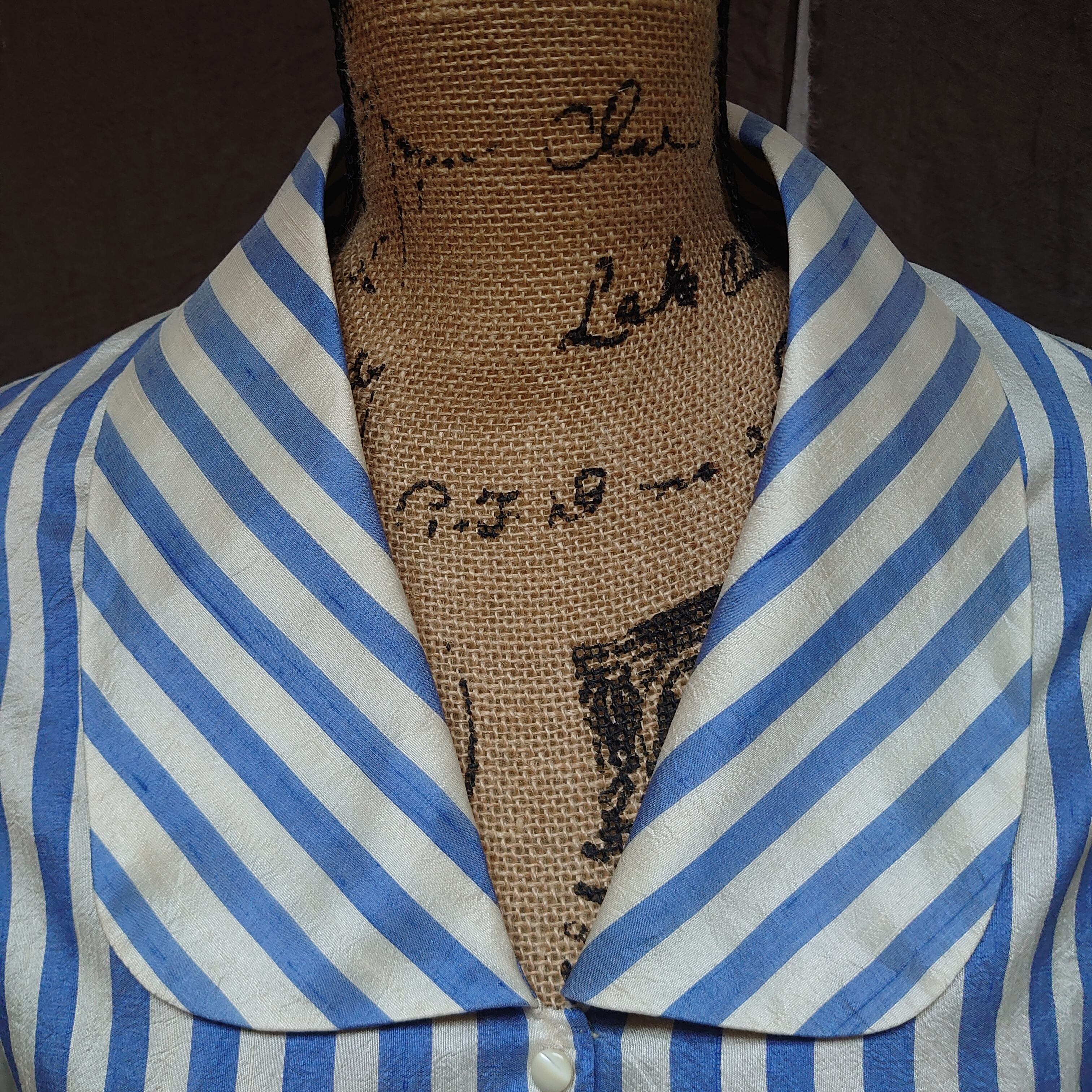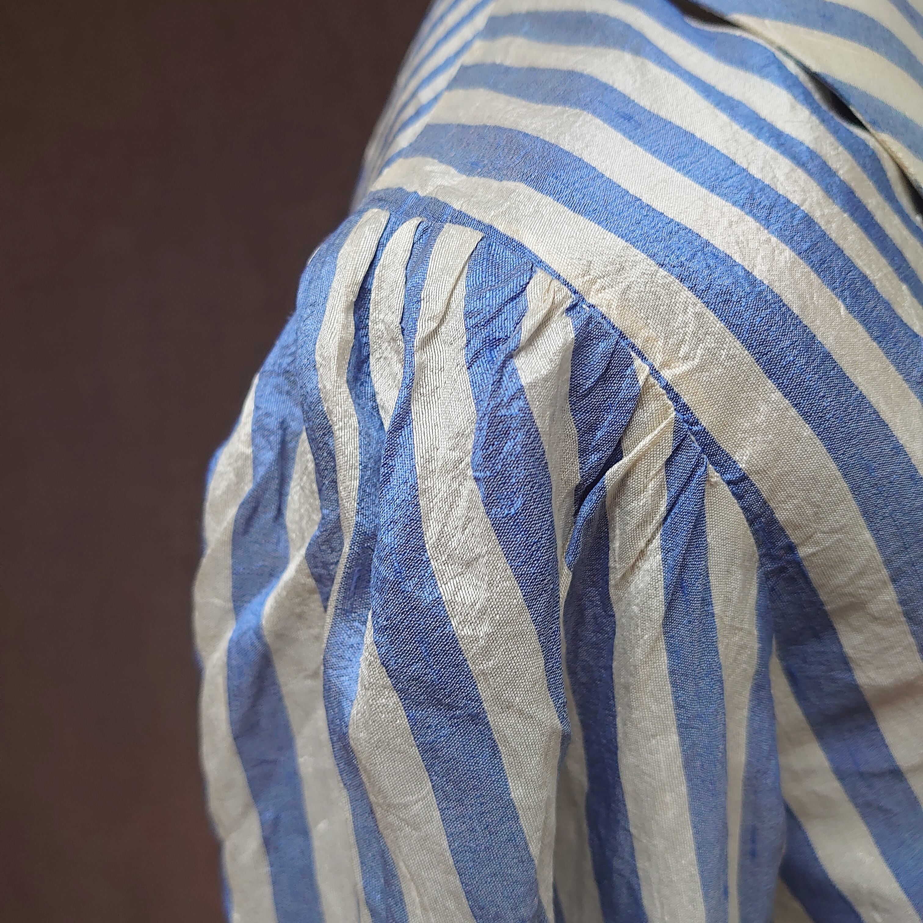 タキシードカラーのような大きめな襟がかわいらしいシルクストライプのブラウスです。