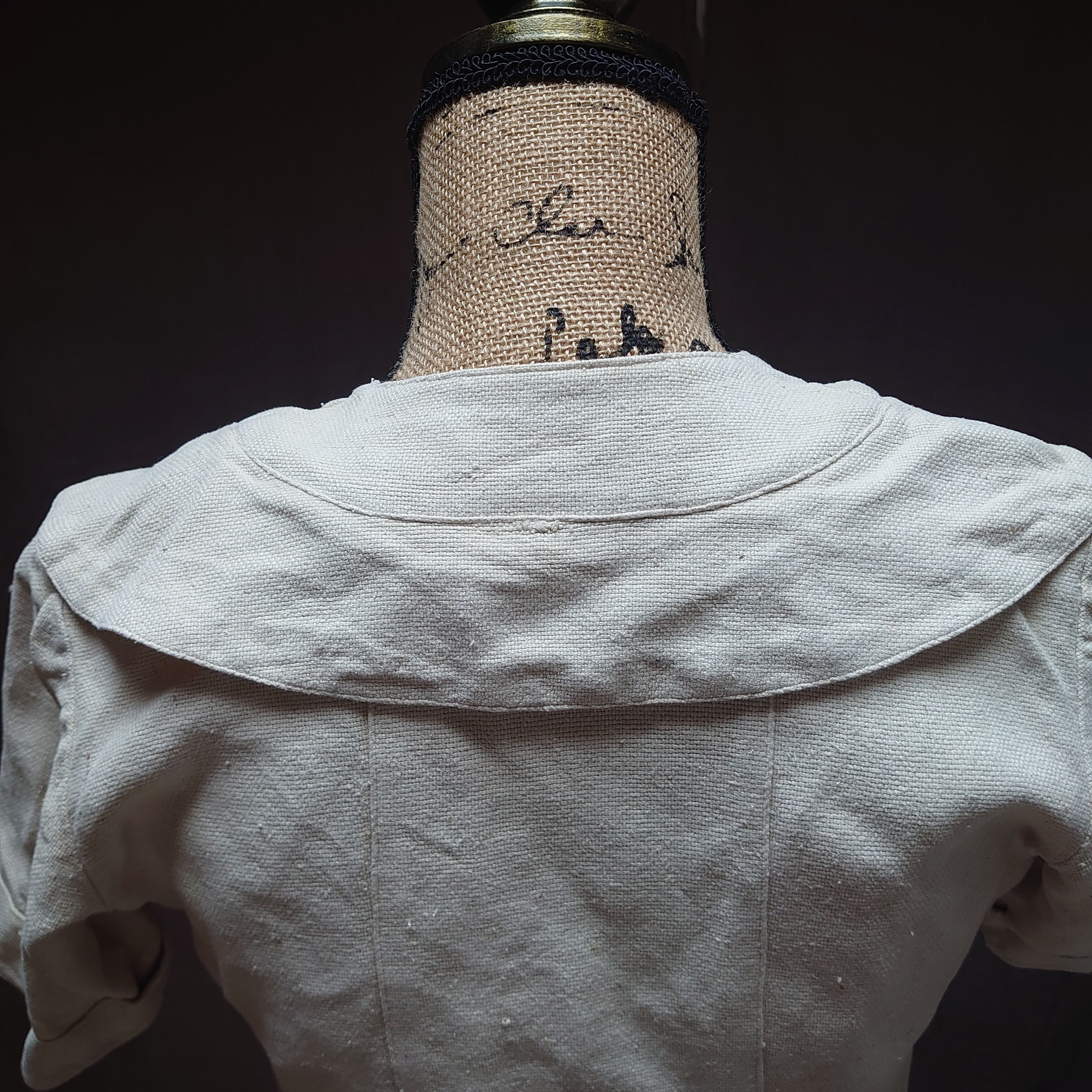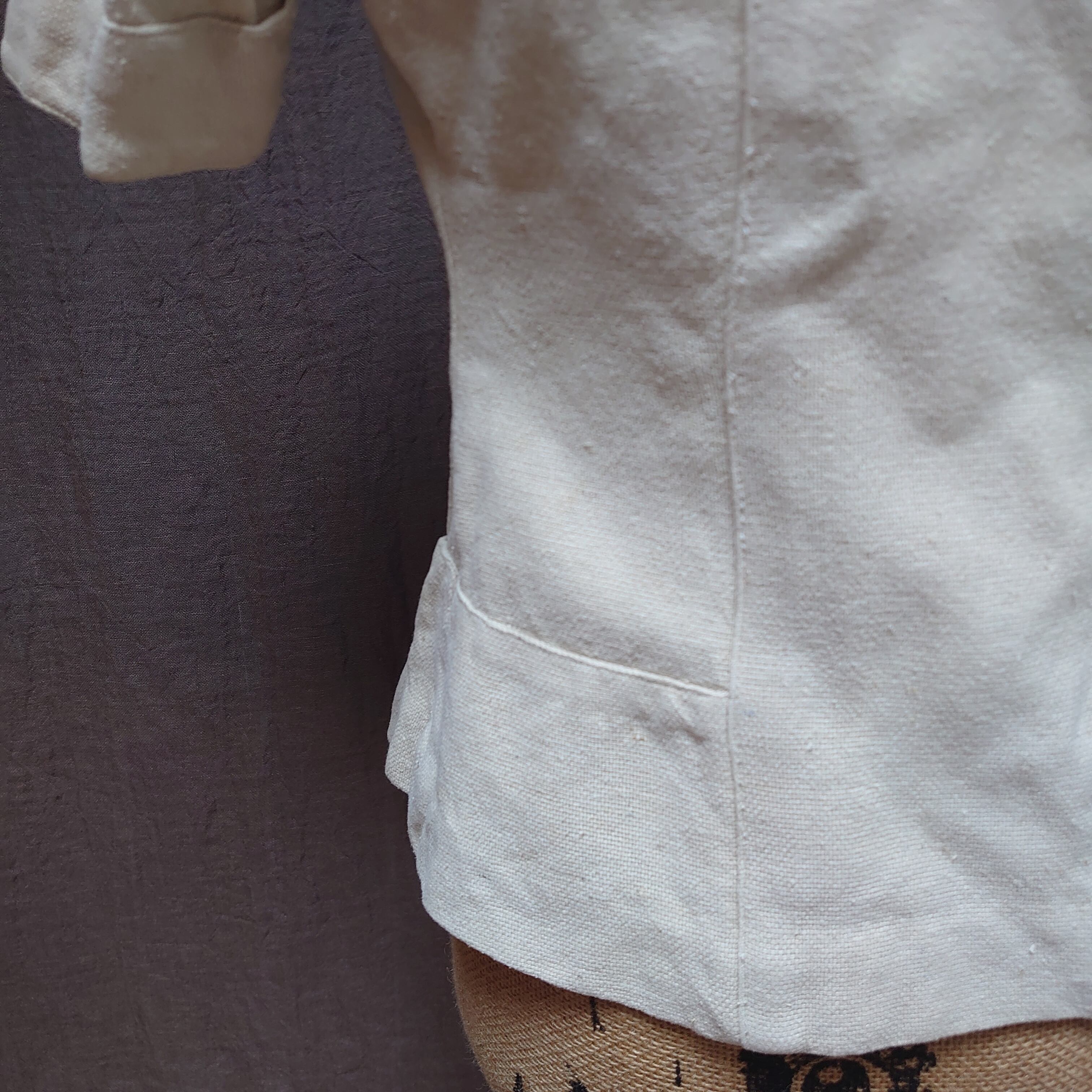 生成りのような薄いベージュのようなナチュラルな色味です。ネップのある粗めなリネン地が時間の経過とともに柔らかくなっています。よく見ると、うす汚れがあります。
