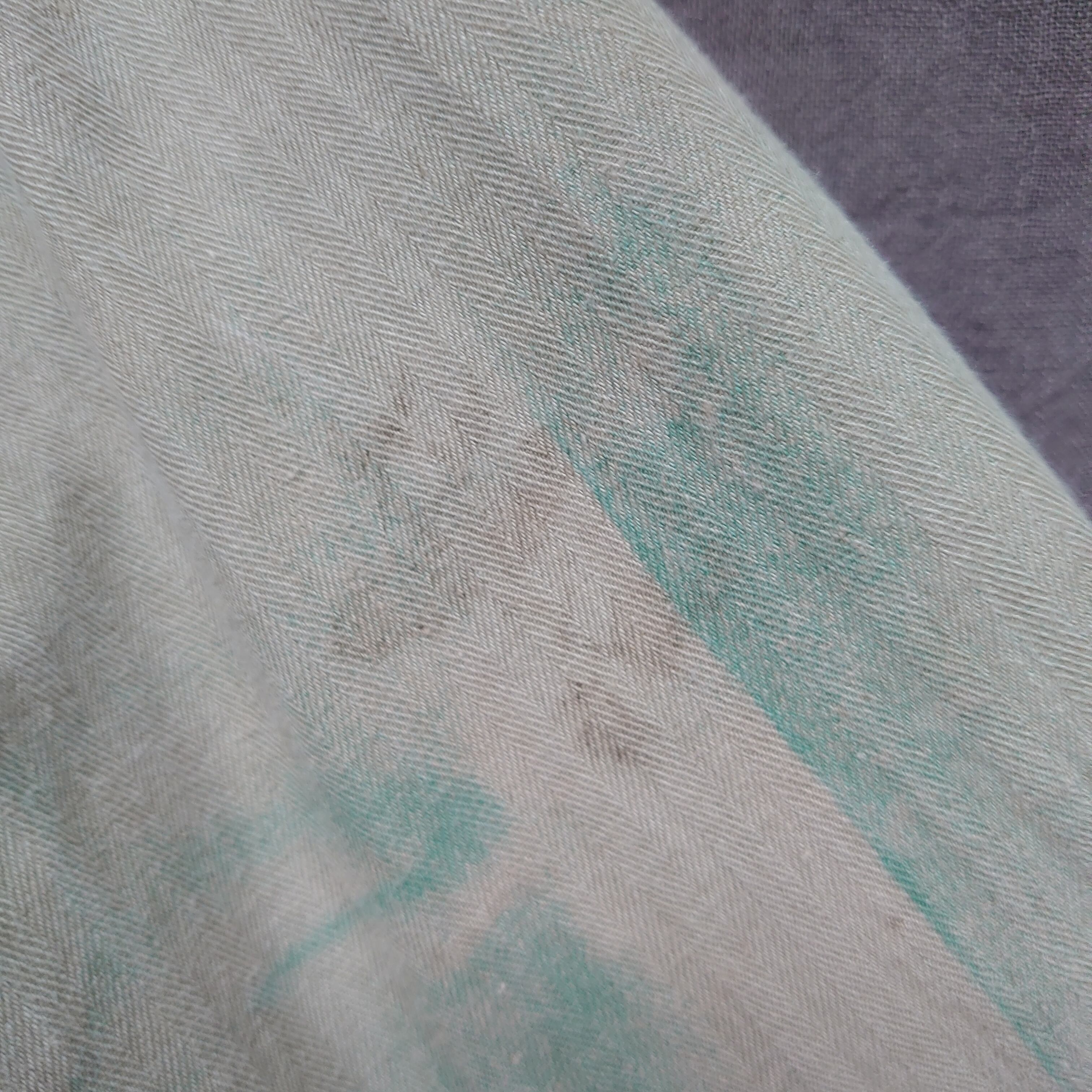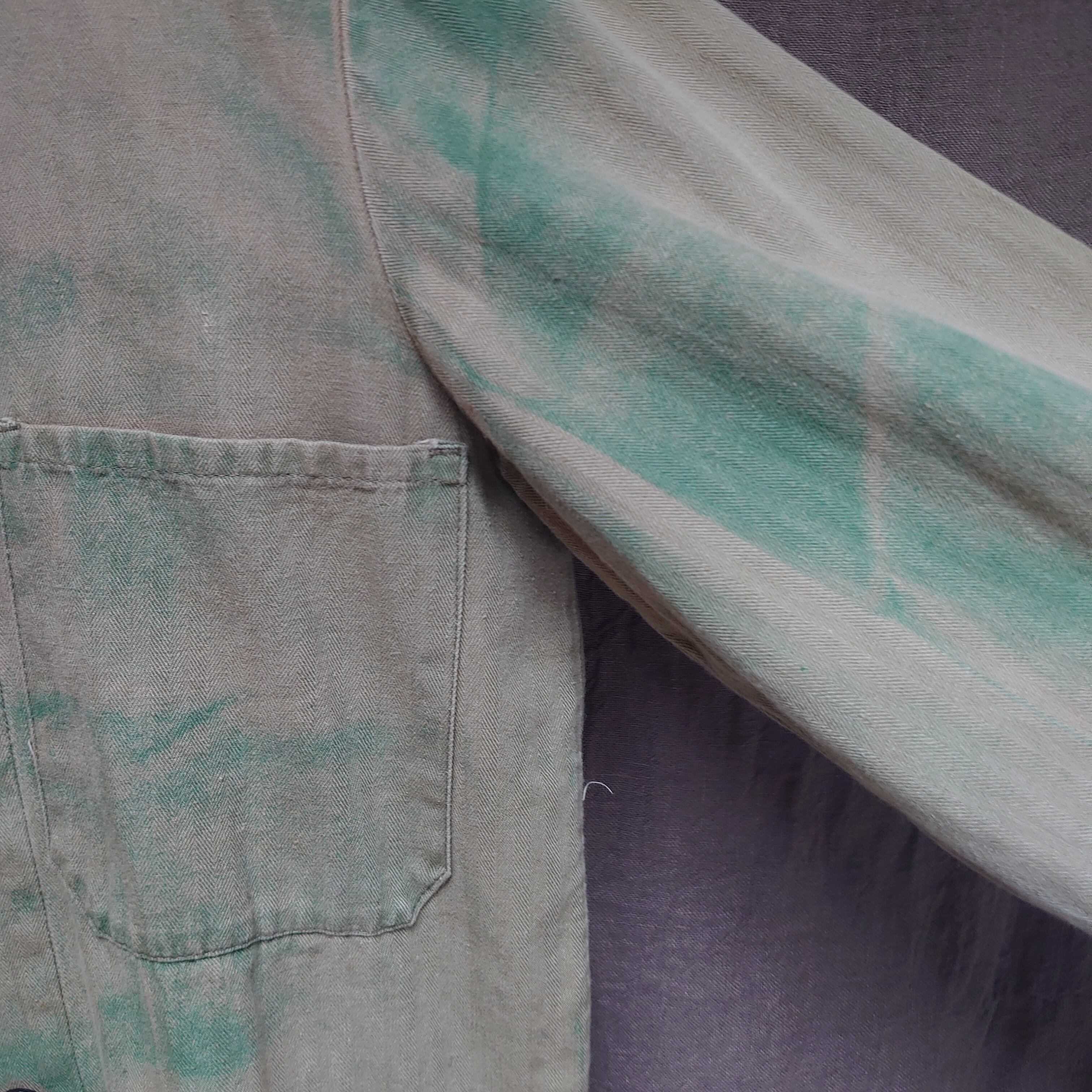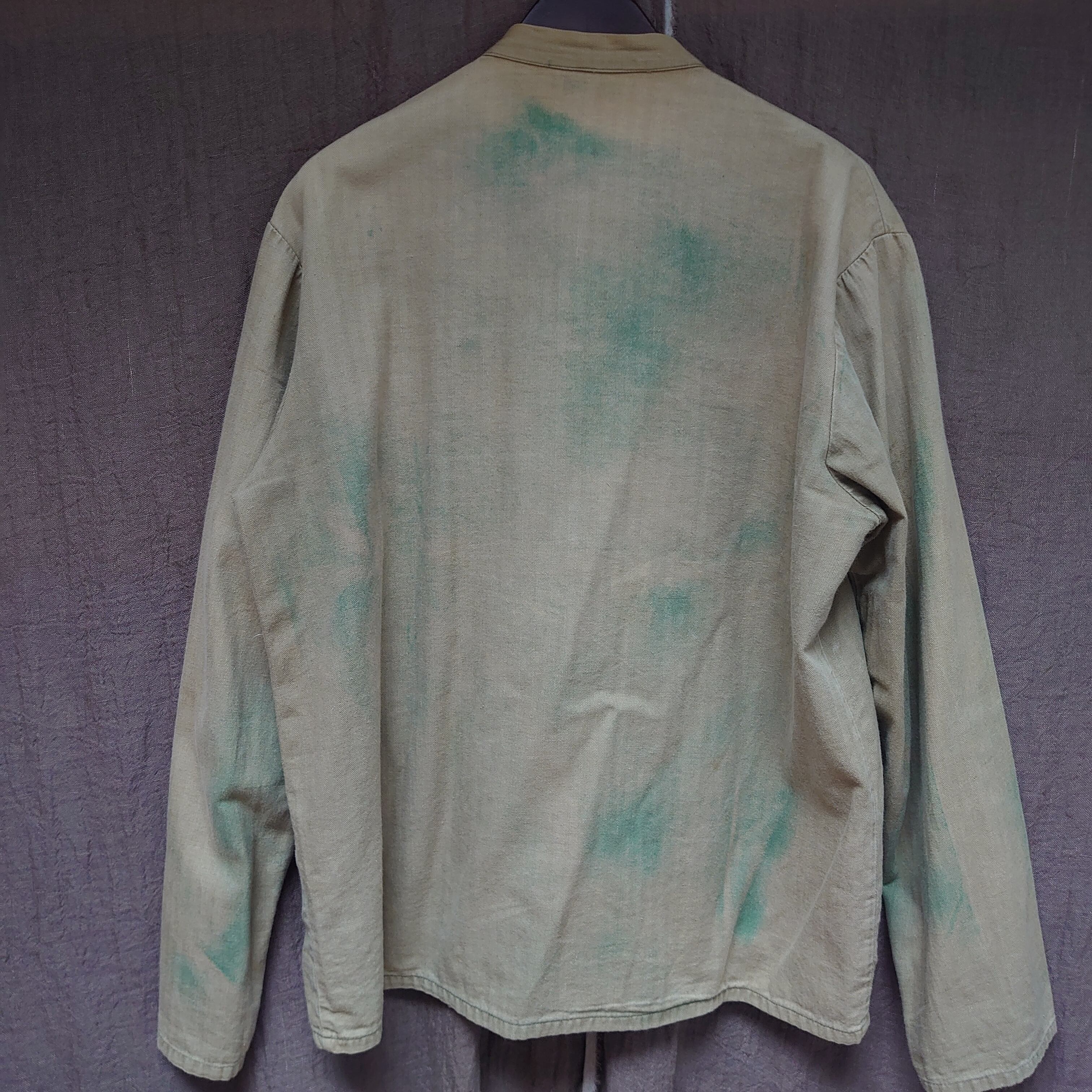 元の色はカーキだと思いますが、汚れを落とすためにブリーチしたのか、かなり色落ちしています。ブリーチしても残った青みがかった汚れと退色したカーキのムラ感がかっこよく仕上がっています。