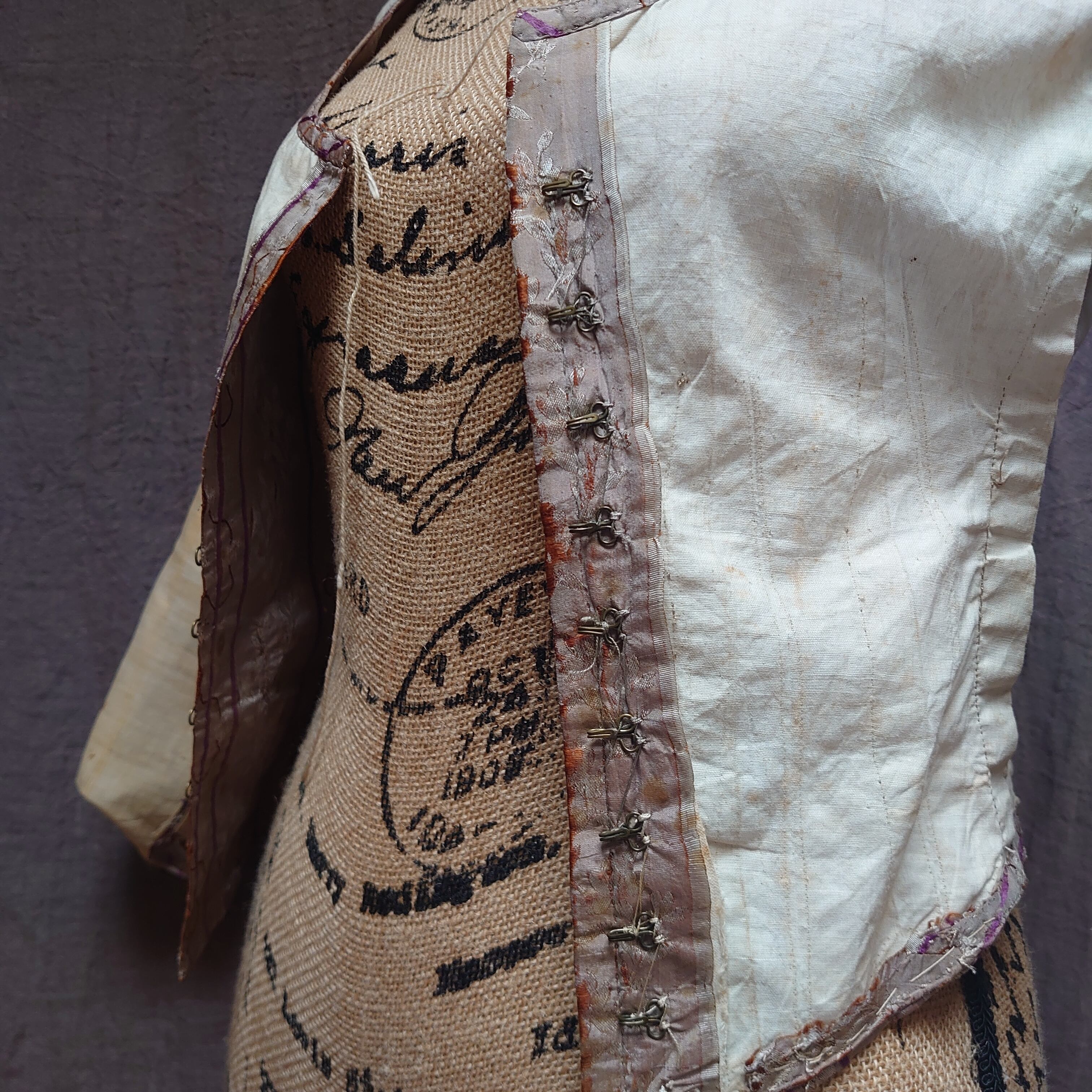 19世紀ぐらいのものなので、生地の破れや汚れなど、フロントホックの欠けがあります。
