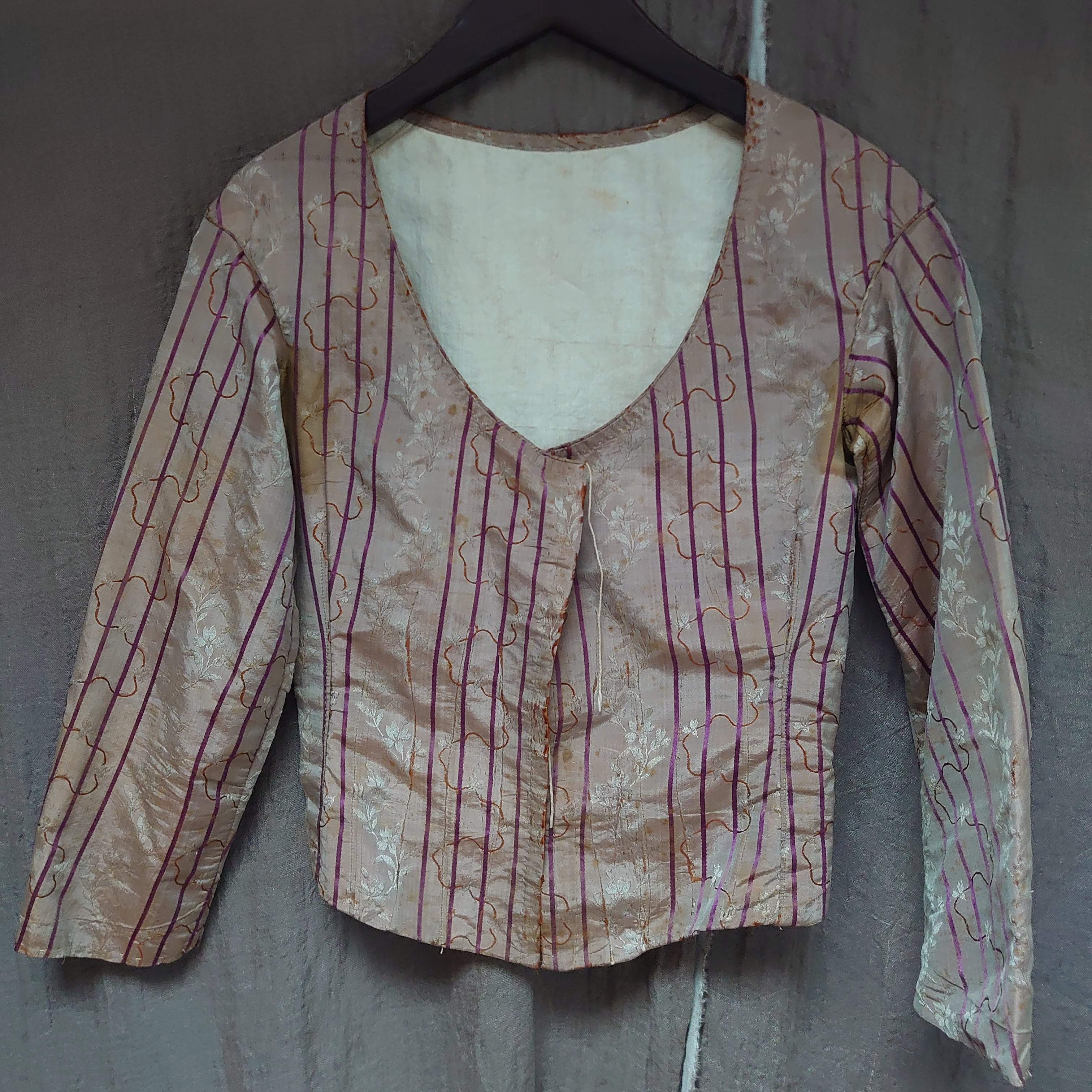 フランスの劇場の舞台や演劇などで使用されていたシアターコスチュームになります。薄い小豆色のようなシルク生地に紫色のストライプが好配色なブラウスで、同色の刺繍が施されています。