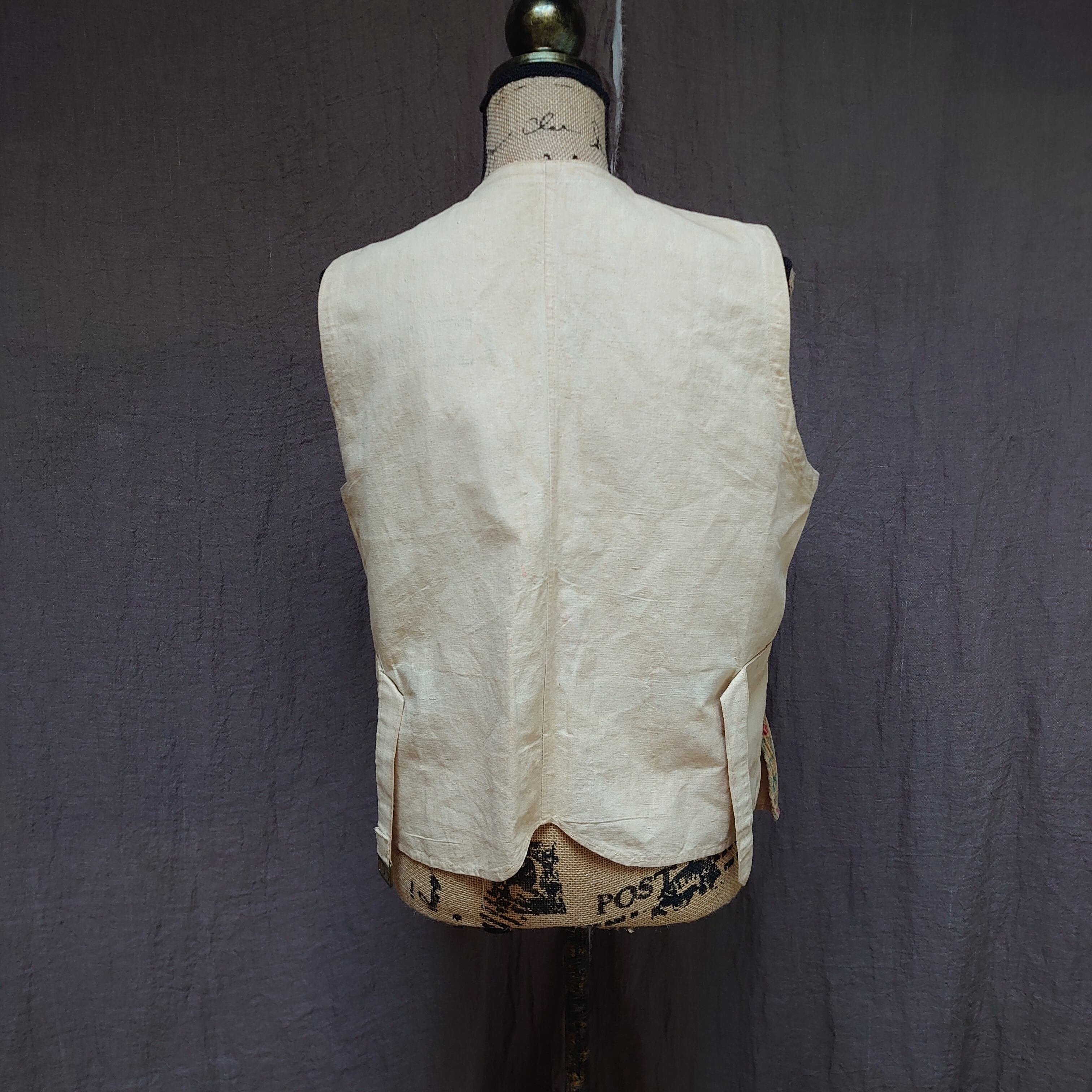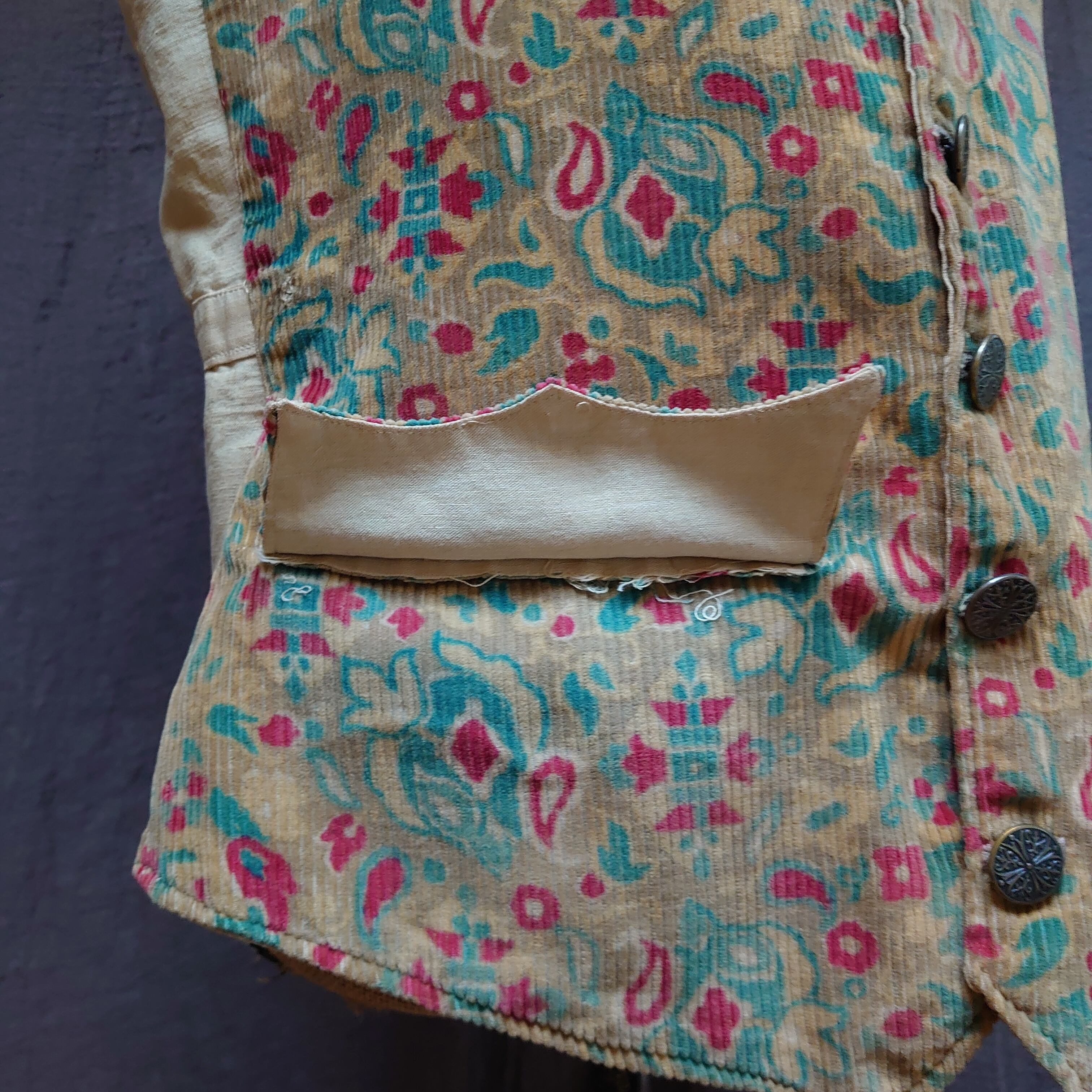 ベージュ地に赤色と青色のかわいらしいプリントがされたコーデュロイベストです。後ろ身頃はおそらくコットンとリネンの混紡です。