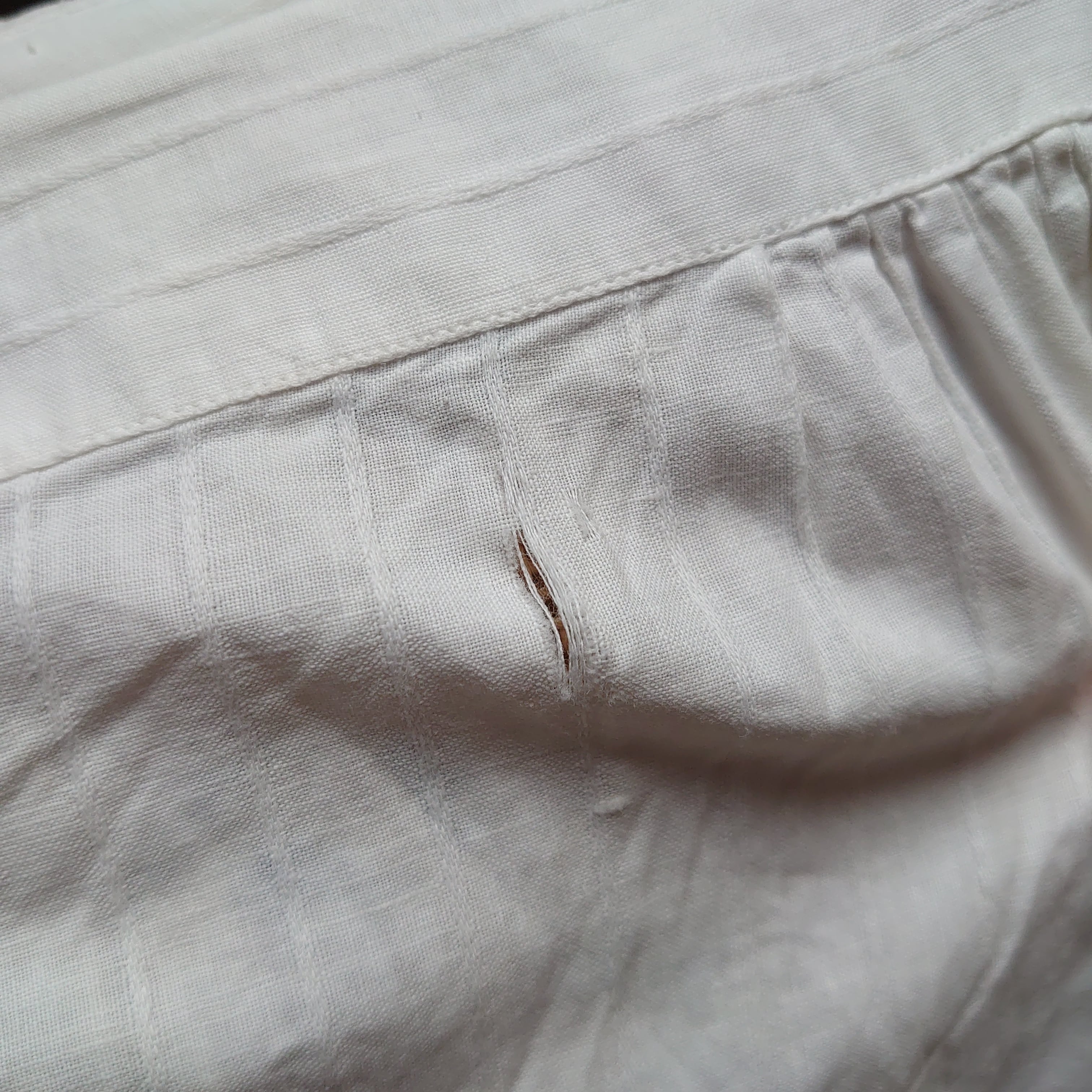 胸部や肩まわりに小さなリペア跡や、生地の裂けや破れがあります。