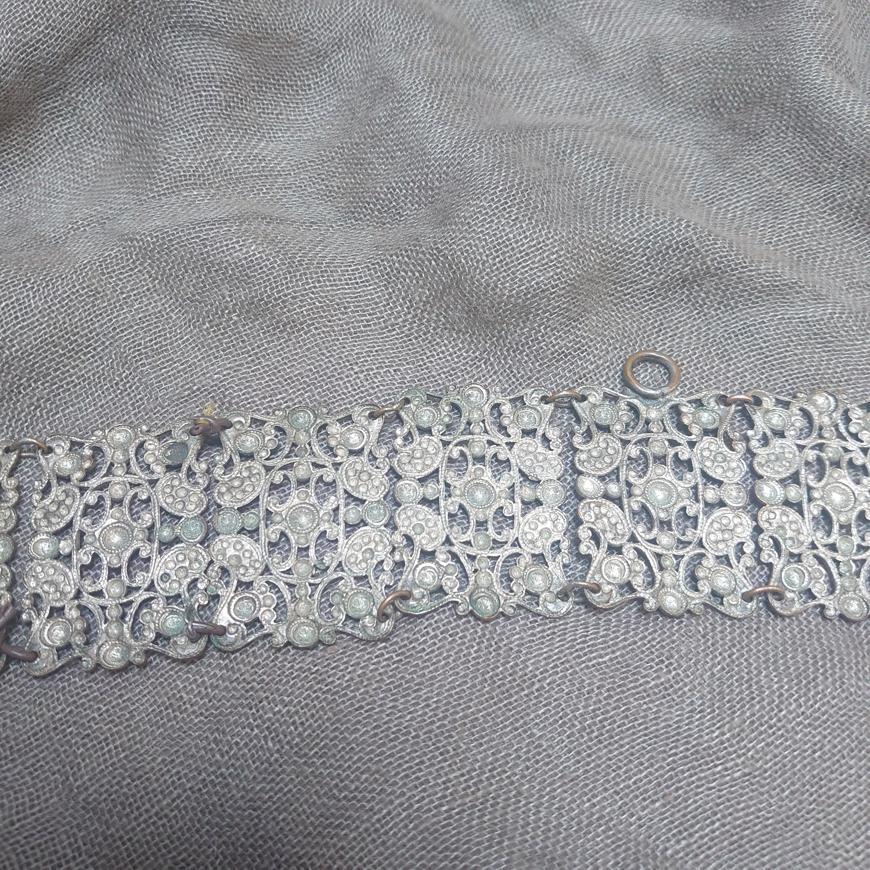 非常に細かなフィリグリー細工が施されたアンティークベルトです。ホワイトメタルで作られていると思いますが、詳細ははっきりしません。