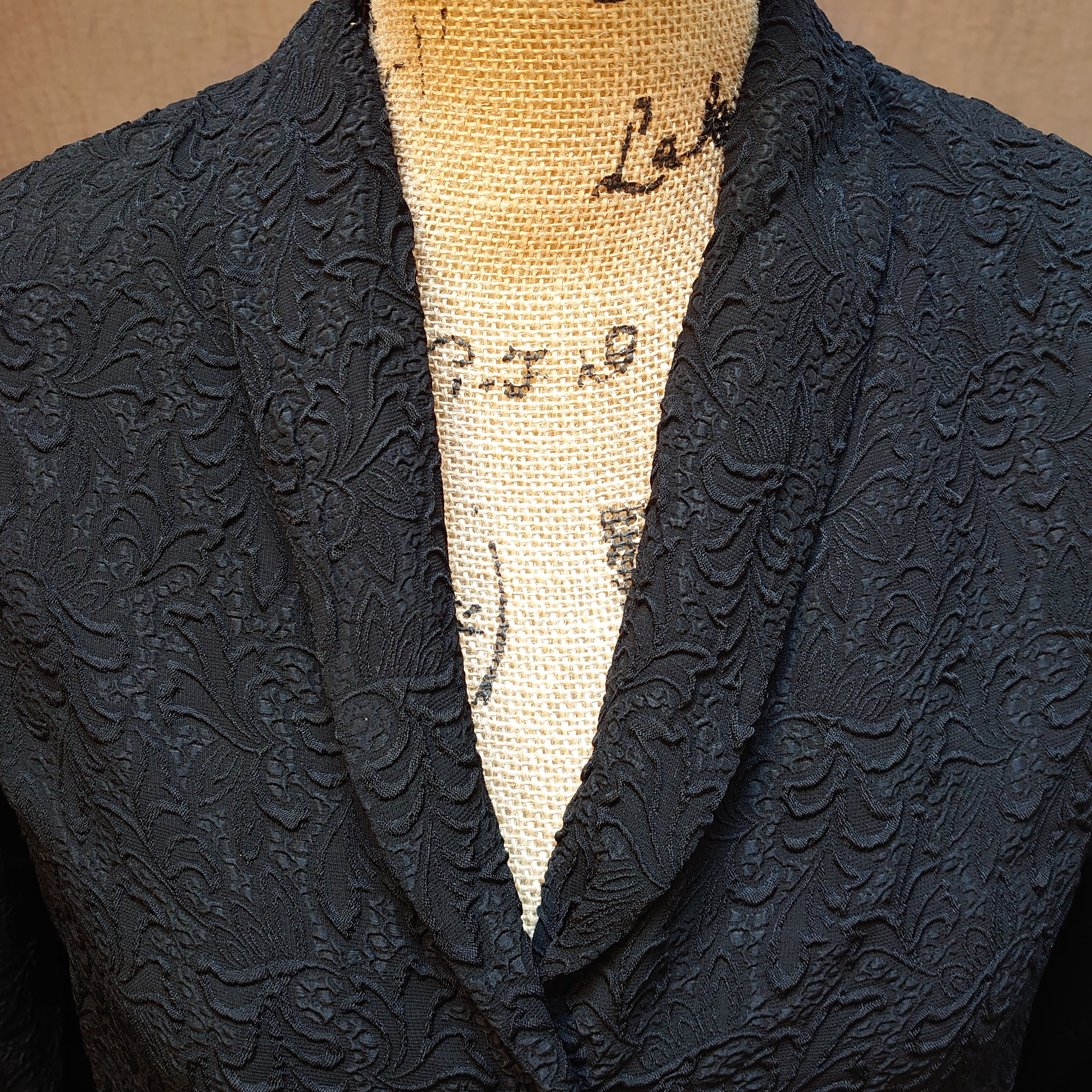 立体的な生地の模様が上品なジャケットです。裏地がないのでカーディガンやブラウスの代わりなど幅広く使えます。