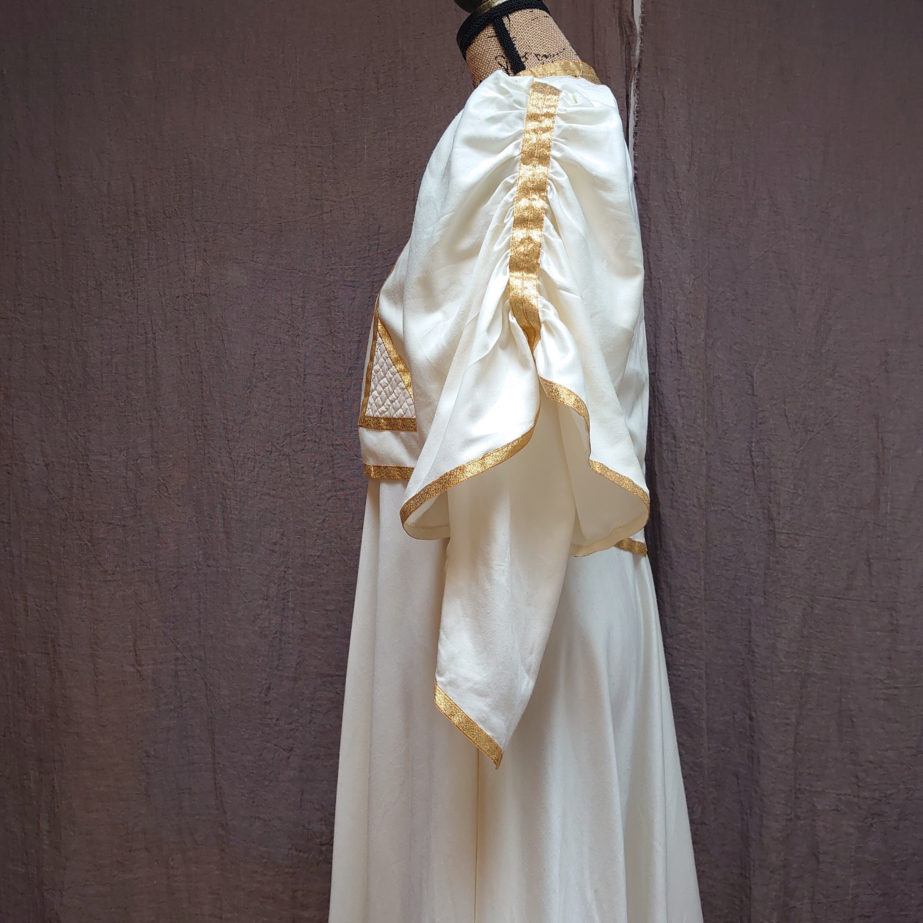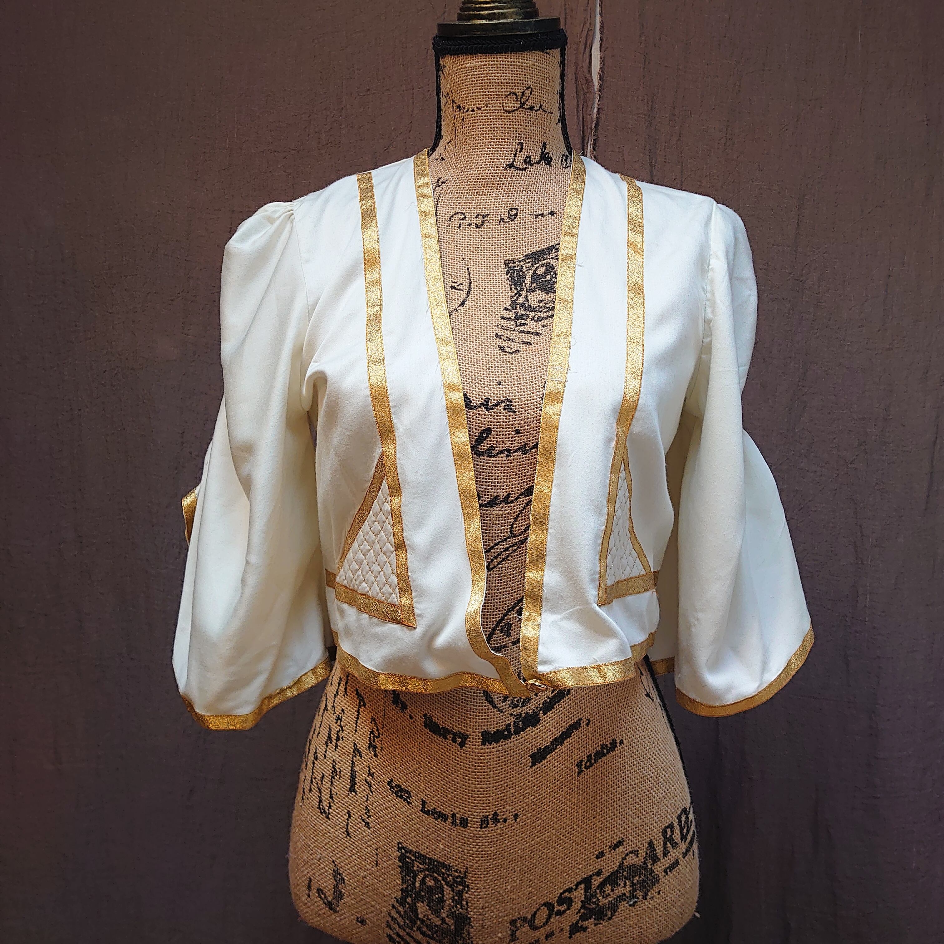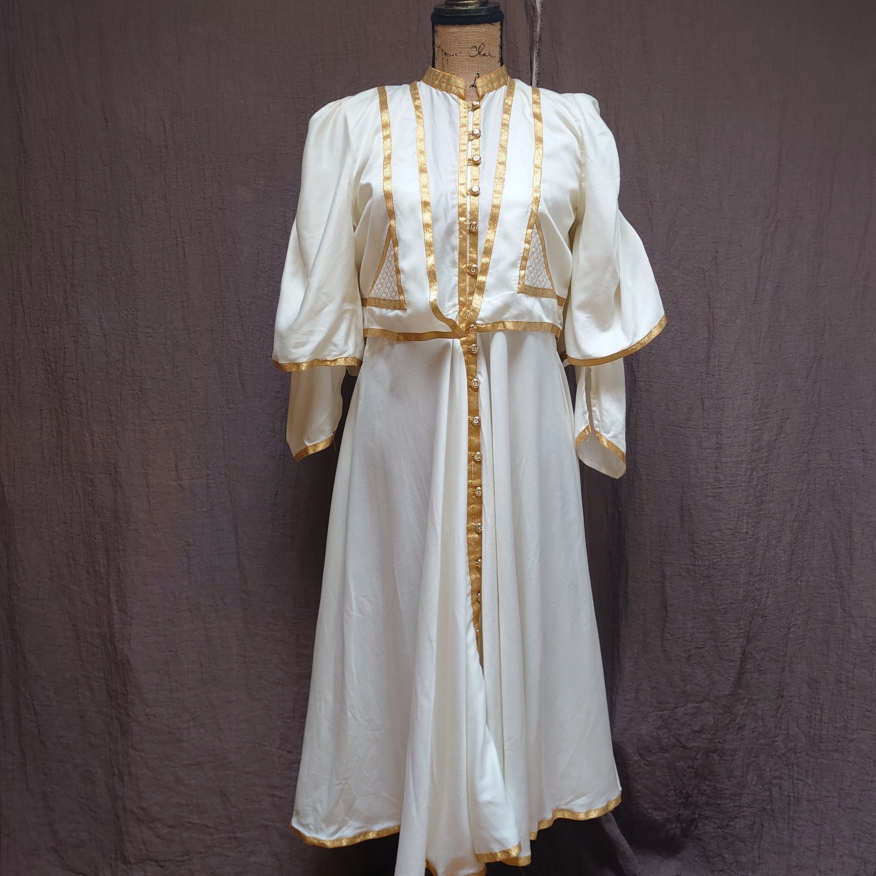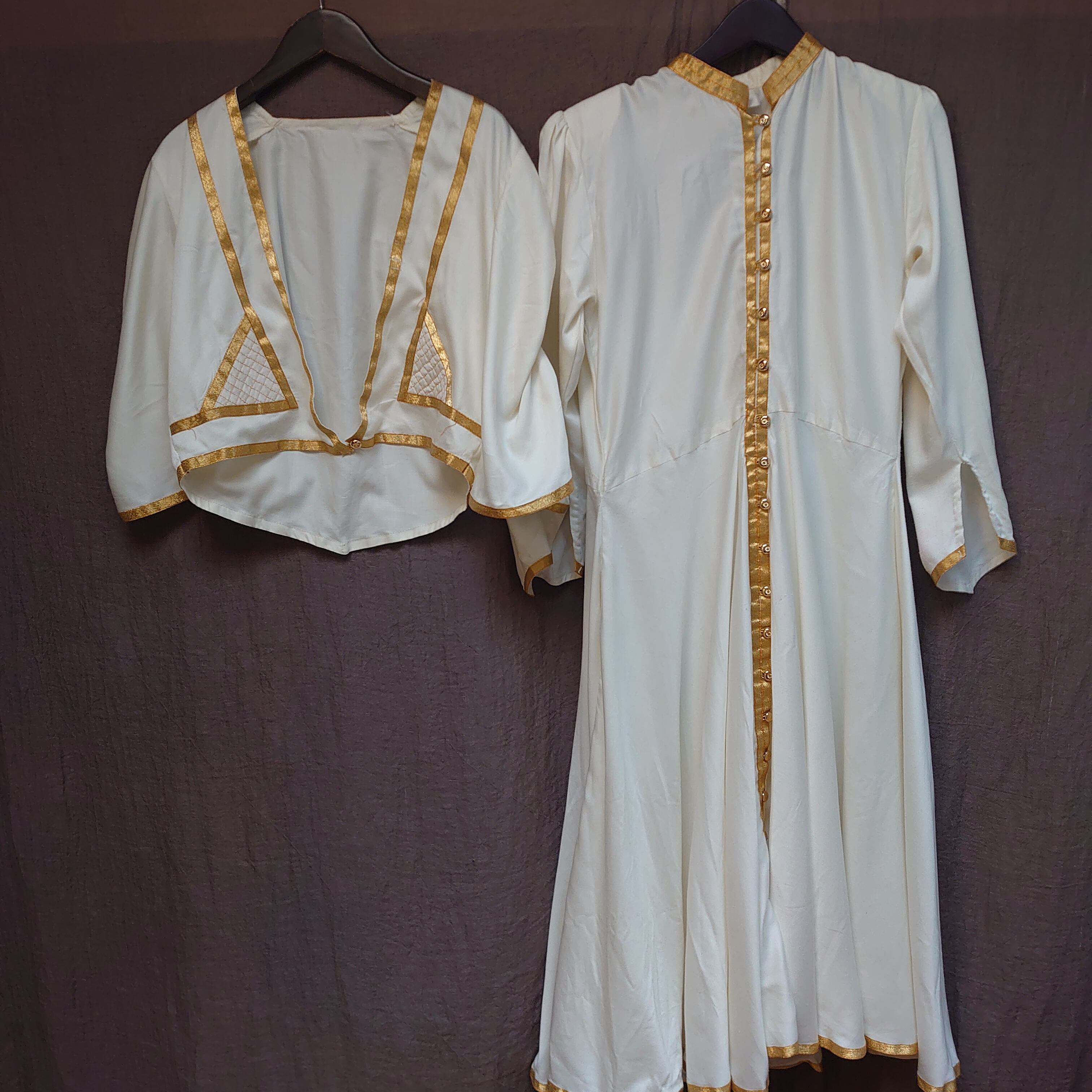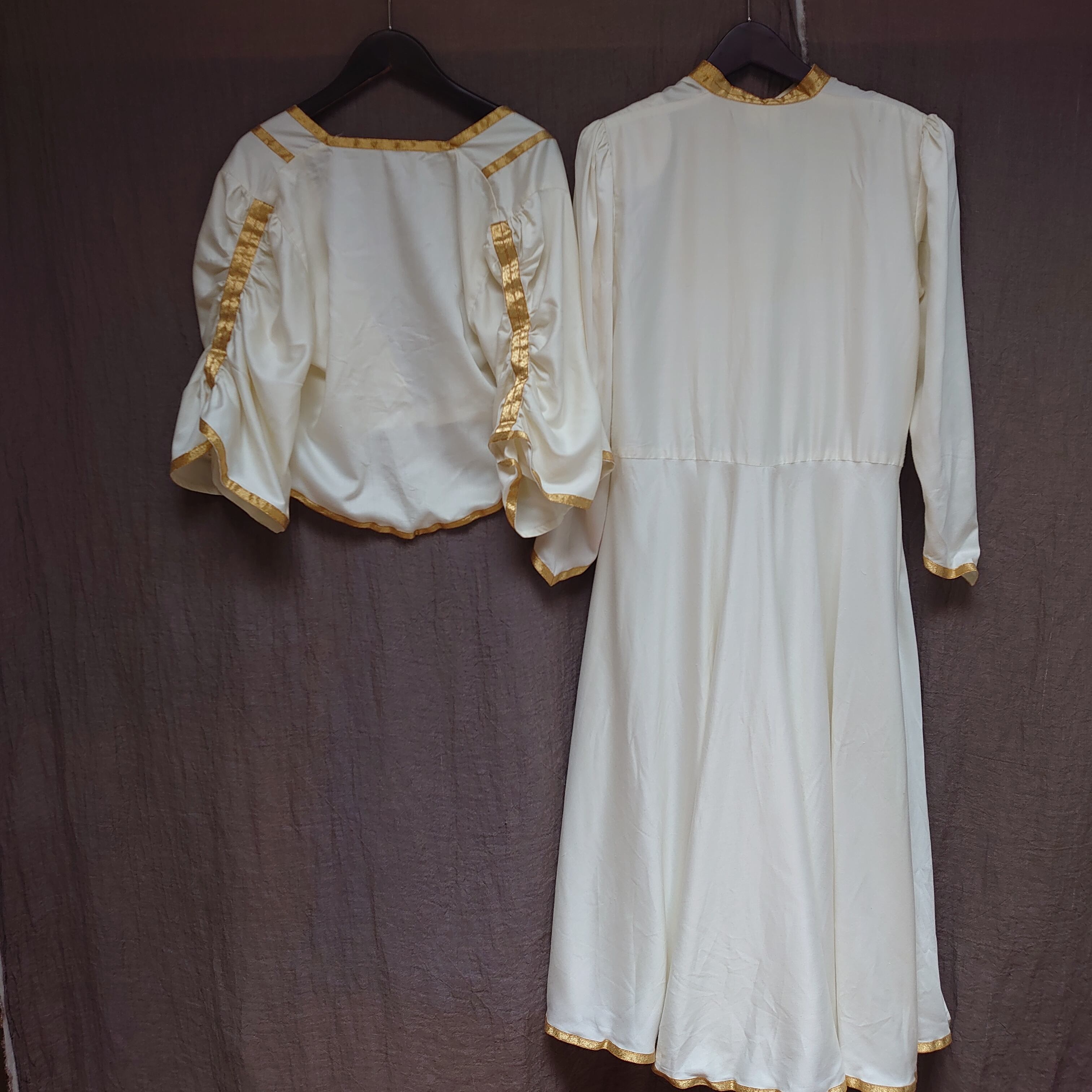 光沢のある白色と金糸が使われたトリムが大変ゴージャスなツーピースドレスです。舞台衣装としても使えそうです。