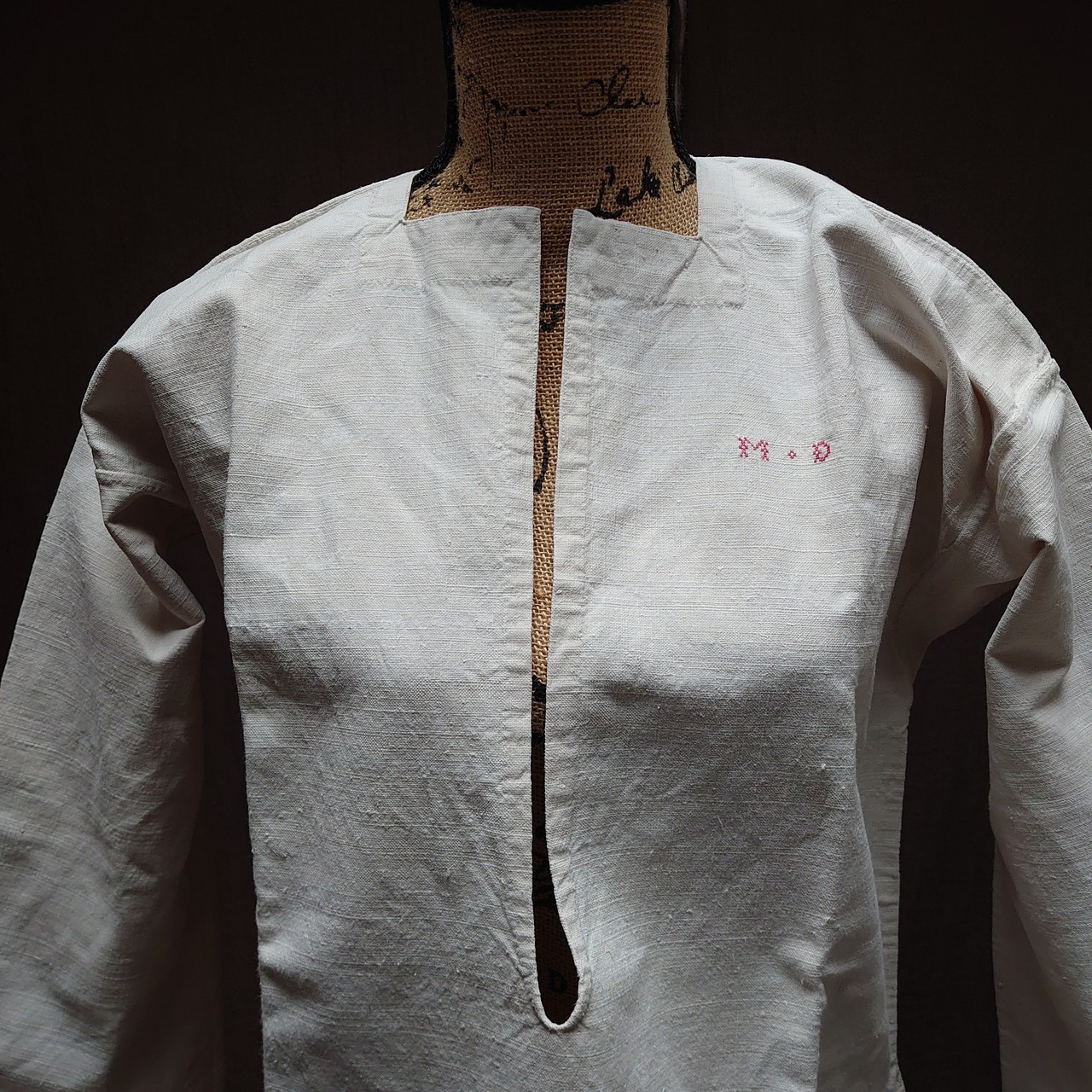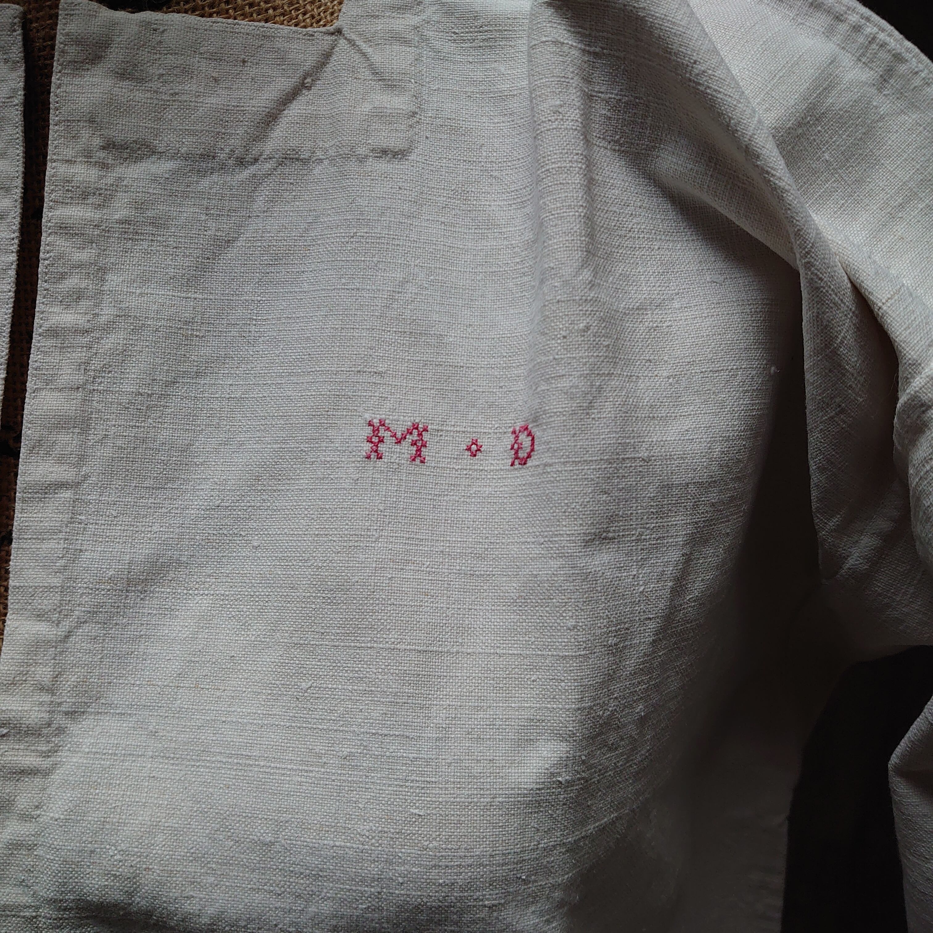 1900'sのフランスのアンティークスモッグシャツ。ギュッと目の詰まったリネンに、パリッとしたハリ感が残るミントコンディションの状態です。