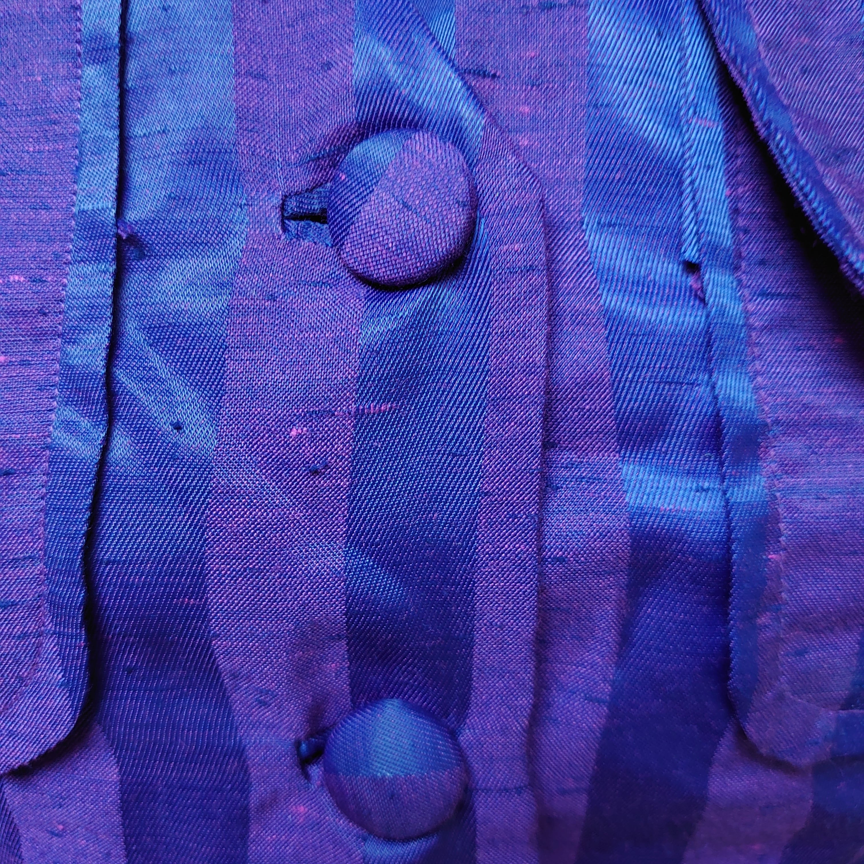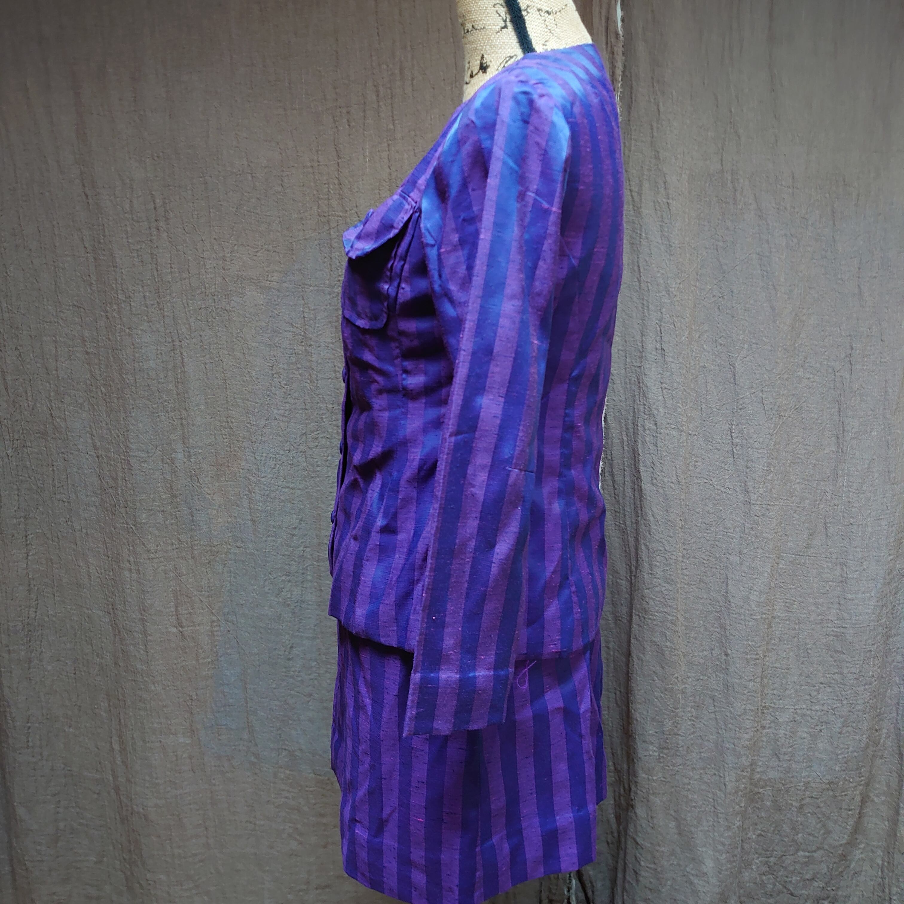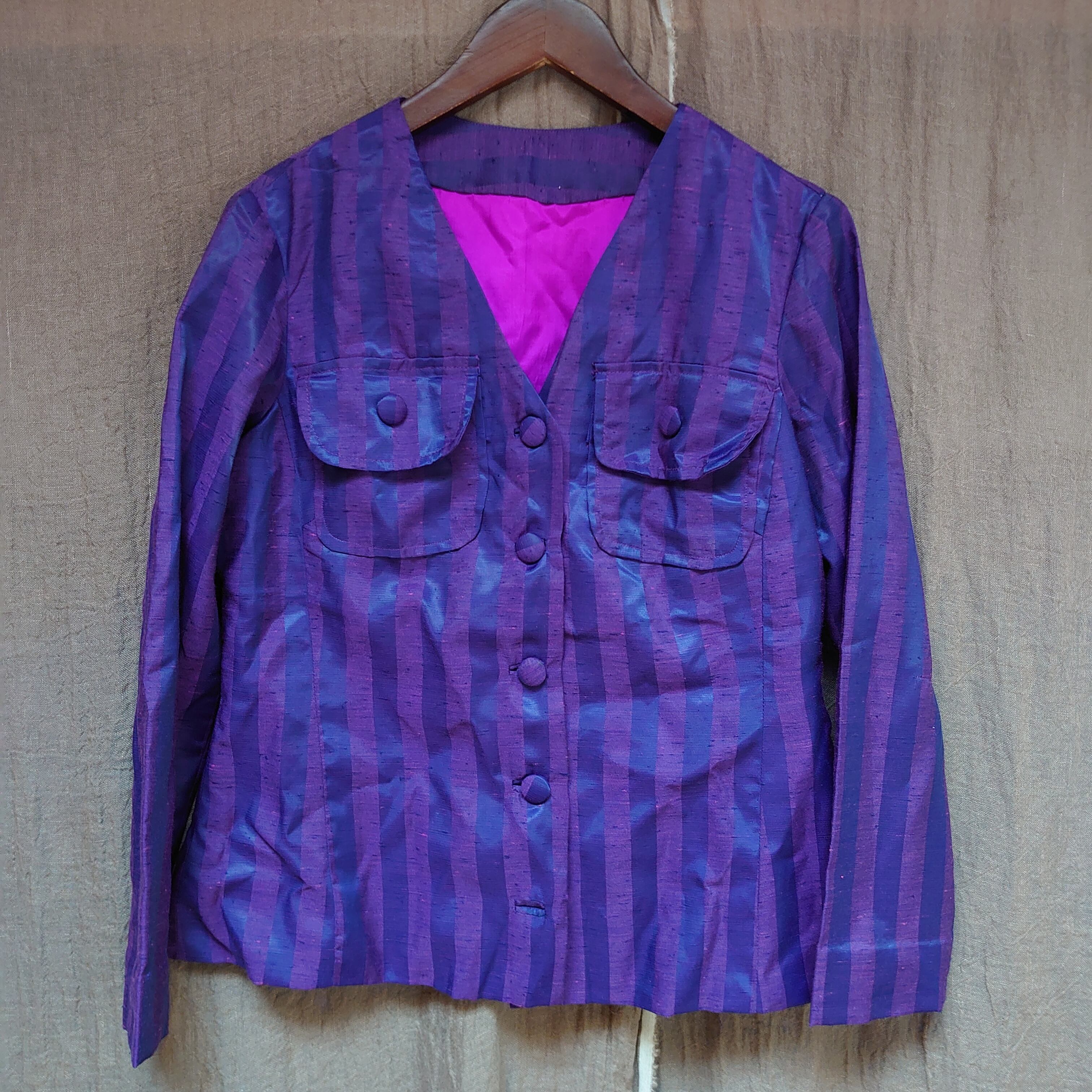 ハンドメイドのセットアップです。薄手の生地のジャケットは襟がないので、カーディガンやジレジャケットの感覚で、単体でも着用できます。