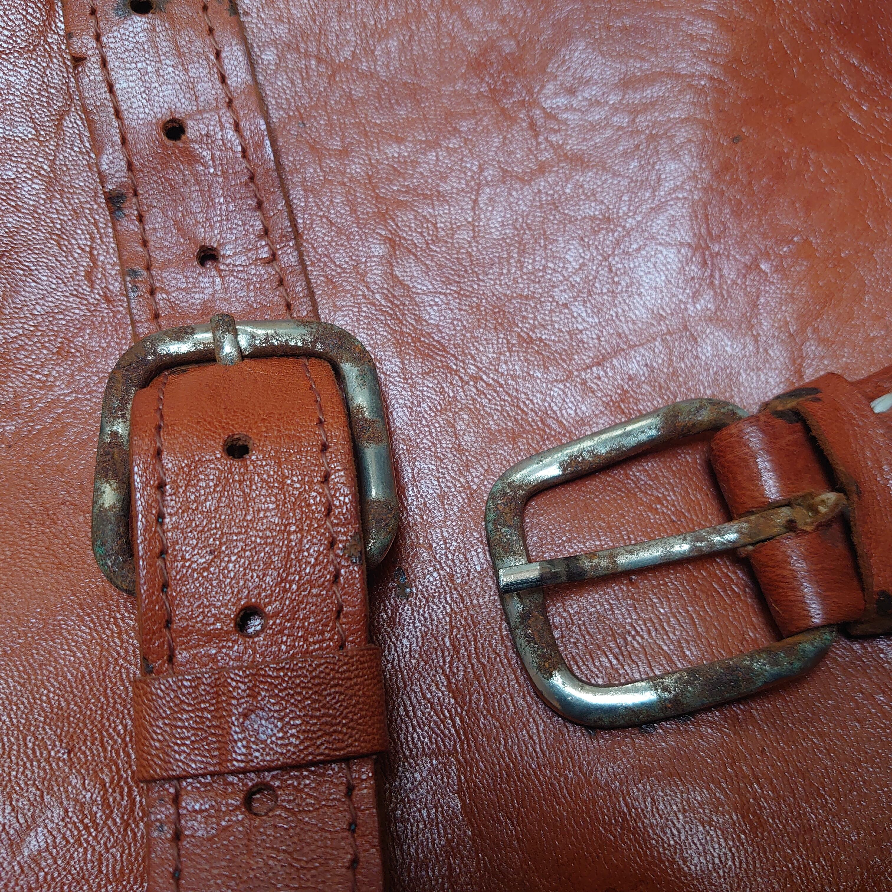 革にはスリキズ、汚れがあります。また、金具にはサビがあります。