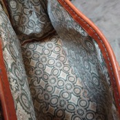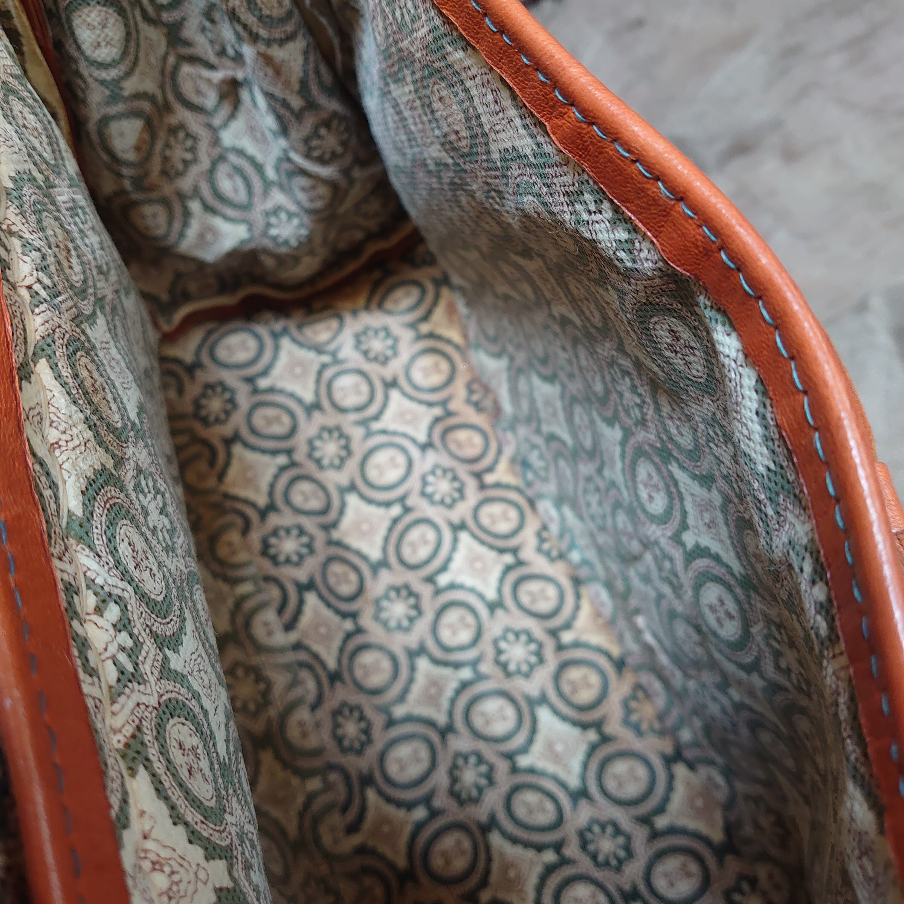 きれいな飴色をしたショルダーバッグで、裏地に使われている生地も可愛らしい柄ものが使われています。