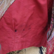 所々に黒のシミがあり、右の脇の箇所に3cmぐらいの、左の脇の箇所に1cmほどの生地の破れがあります。左右の袖口がカットされたためか、生地がほつれてきています。