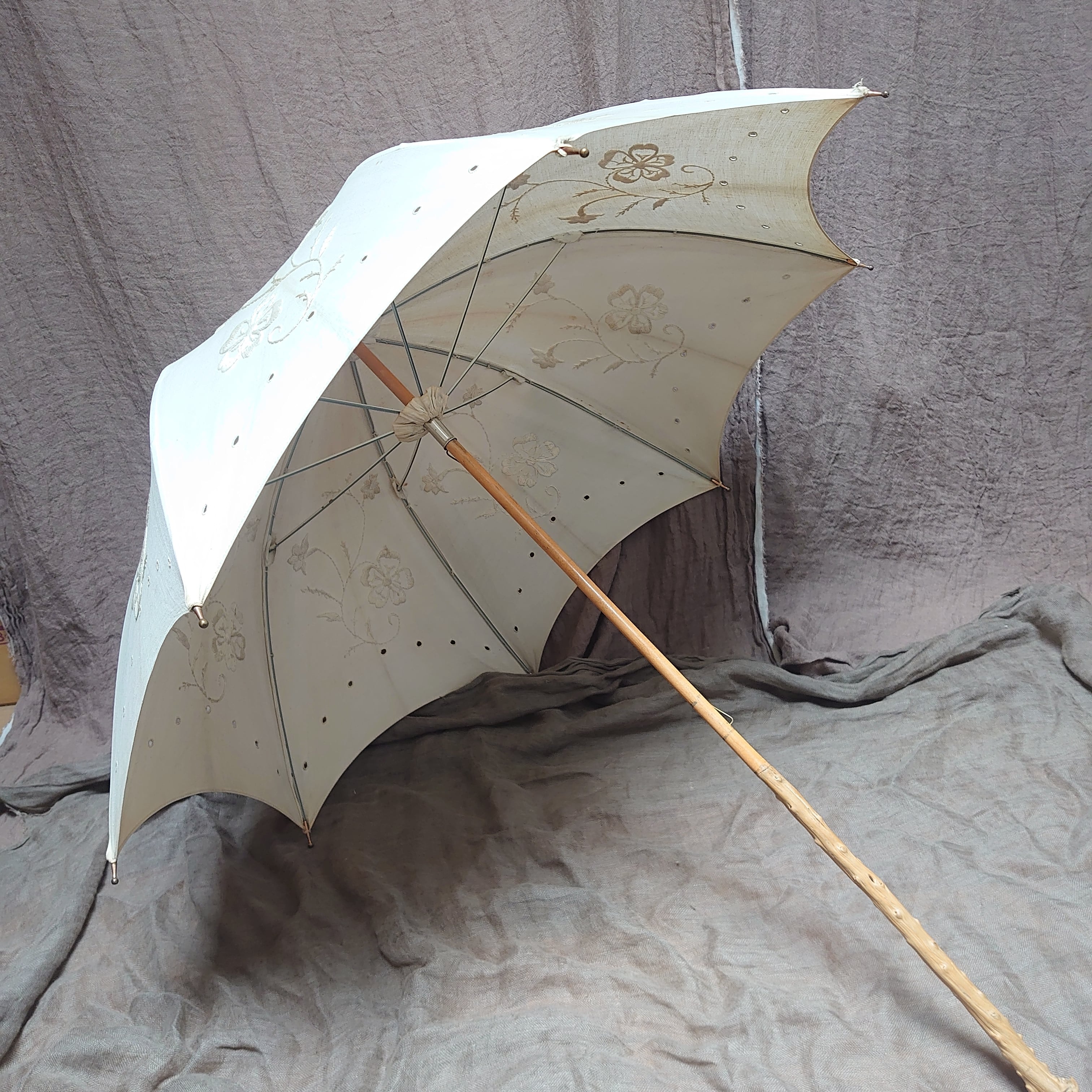 生成りのリネン地に花柄の刺繍が可愛らしいアンティークの日傘になります。